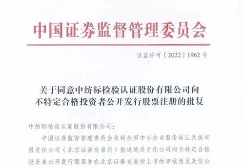 8月31日,據(jù)北京證券交易所官網(wǎng)公告,中國證監(jiān)會(huì)同意中紡標(biāo)檢驗(yàn)認(rèn)證股份有限公司向不特定合格投資者公開發(fā)行股票的注冊(cè)申請(qǐng)。這意味著,中紡標(biāo)登陸北交所再進(jìn)一步,將在近期啟動(dòng)股票發(fā)行。