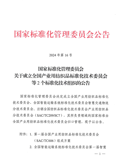 近日,國家標準化管理委員會2024年第16號文發(fā)布公告,決定成立全國產(chǎn)業(yè)用紡織品標準化技術(shù)委員會,編號為SAC/TC 606,英文名稱為National Technical Committee 606 on Technical Textiles of Standardization Administration of China,主要負責產(chǎn)業(yè)用紡織品基礎(chǔ)通用、實驗方法、產(chǎn)品性能等領(lǐng)域國家標準制修訂工作。同時注銷全國紡織品標準化技術(shù)委員會產(chǎn)業(yè)用紡織品分技術(shù)委員會(SAC/TC209/SC7),其所負責領(lǐng)域的國家標準由全國產(chǎn)業(yè)用紡織品標準化技術(shù)委員會歸口管理。