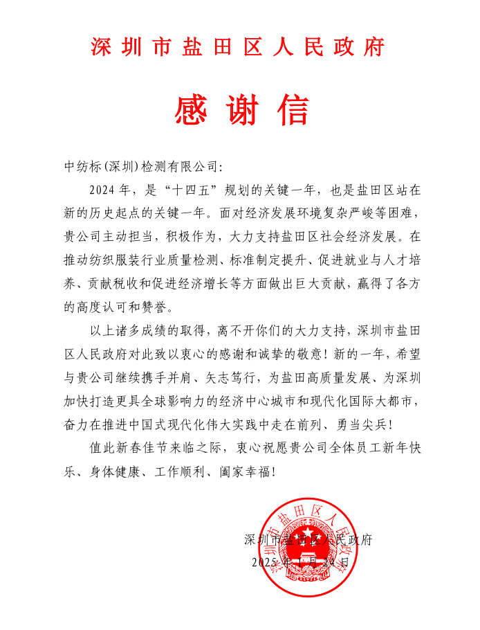 新年伊始,通用技術(shù)中紡標(biāo)(深圳)檢測有限公司(以下簡稱“深圳中紡標(biāo)”)收到了深圳市鹽田區(qū)人民政府的感謝信,對2024年深圳中紡標(biāo)在面對經(jīng)濟發(fā)展環(huán)境復(fù)雜嚴(yán)峻等困難,主動擔(dān)當(dāng),積極作為,助力鹽田區(qū)社會經(jīng)濟發(fā)展,在推動紡織服裝行業(yè)質(zhì)量檢測、標(biāo)準(zhǔn)制定提升、促進就業(yè)與人才培養(yǎng)、貢獻稅收和促進經(jīng)濟增長等方面給予了充分肯定和高度評價。