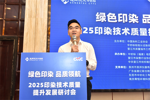 4月24日,由中國染料工業(yè)協(xié)會、通用技術中紡標檢驗認證股份有限公司(以下簡稱“中紡標”)、晉江市質(zhì)量強市工作領導小組辦公室聯(lián)合主辦,中紡標(福建)檢測有限公司(以下簡稱“福建中紡標”)、晉江市染整行業(yè)協(xié)會、中共晉江市紡織鞋服產(chǎn)業(yè)鏈委員會聯(lián)合承辦,泉州市美邦儀器有限公司、廣東省嘉億聯(lián)合數(shù)碼科技有限公司、東莞市中紡化工有限公司、南京尊恒環(huán)境科技有限公司支持的“綠色印染 品質(zhì)領航︱ 2025印染技術質(zhì)量提升發(fā)展研討會”在晉江成功舉辦。